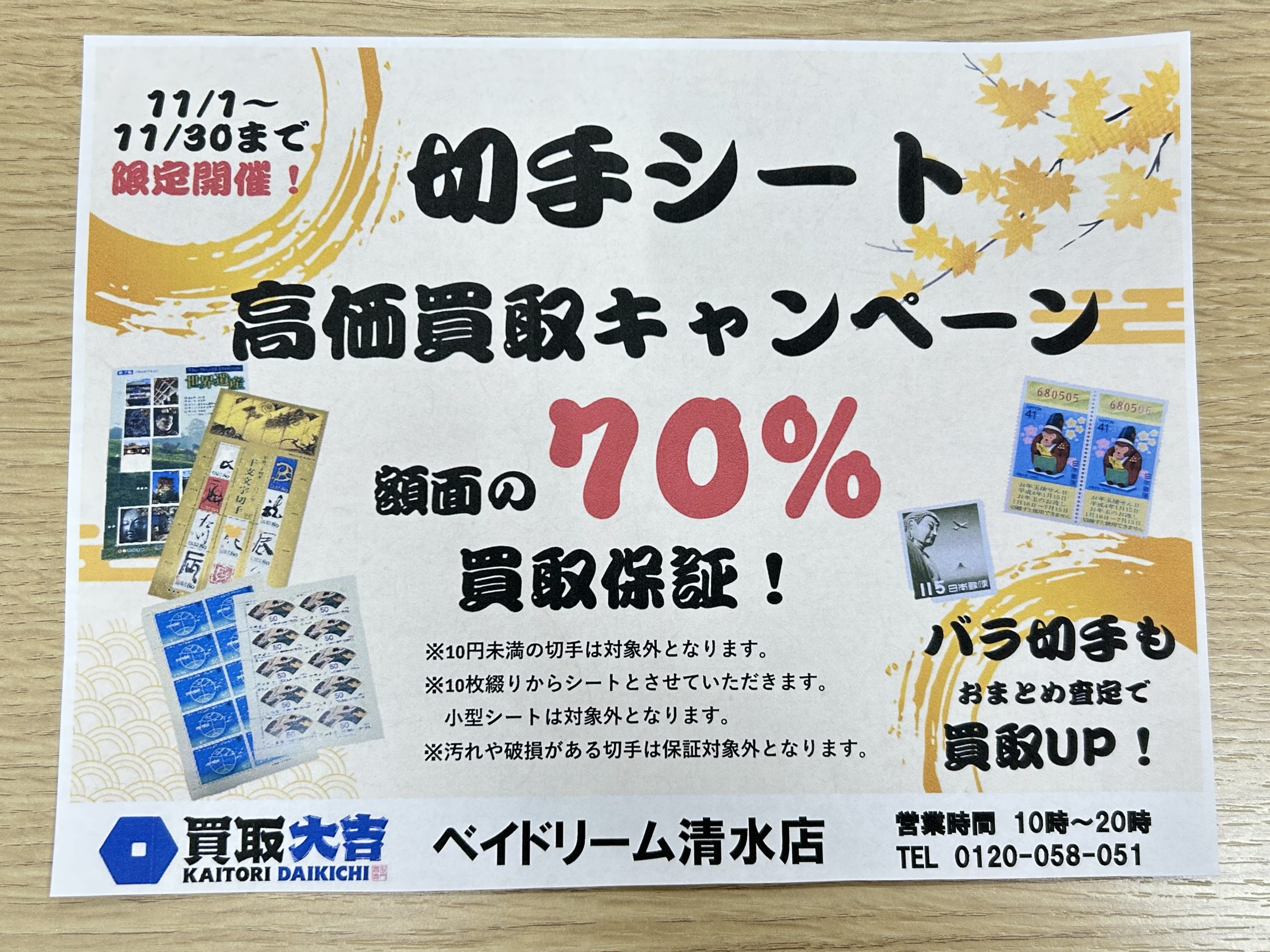 切手シート額面の70%で買取!