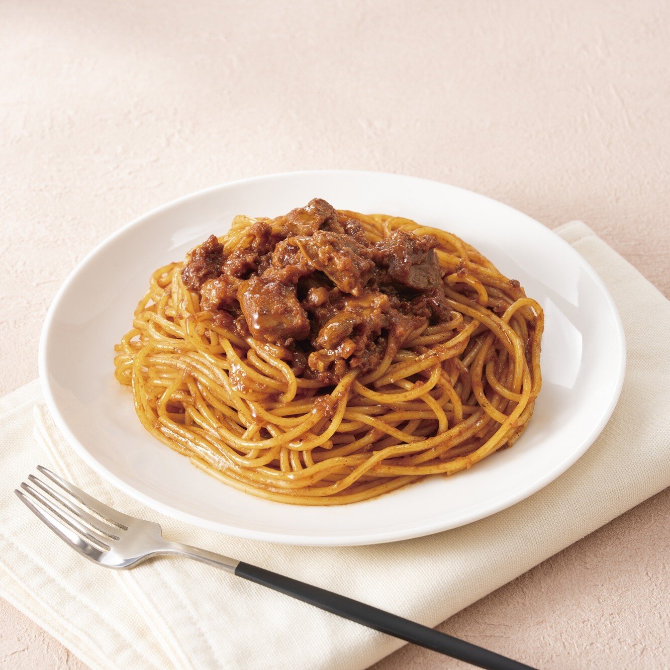 ゴロっとしたビーフの食感とうまみが感じられる、特製ラグーソースパスタです。野菜だしとともに煮込まれた贅沢感のあるコク深い味わい